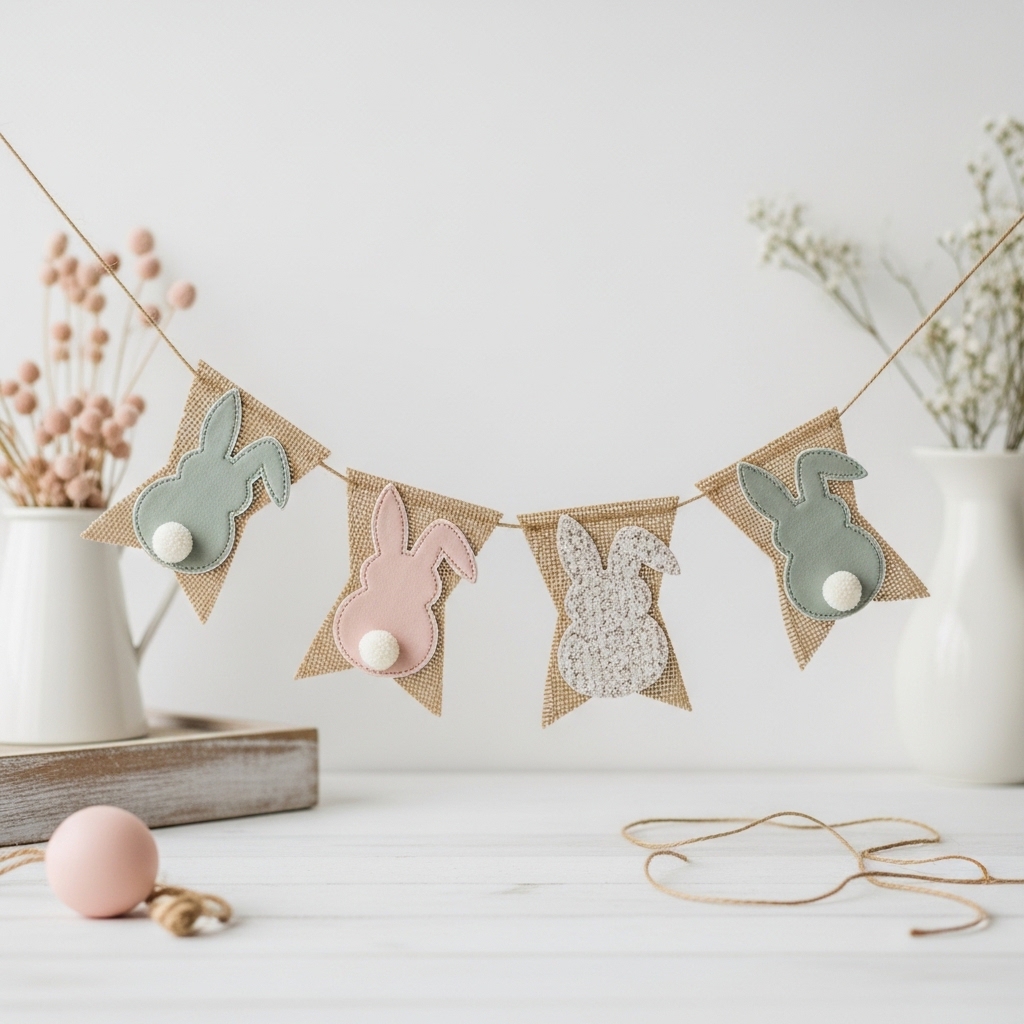 Burlap bunny banners add a handcrafted texture that instantly softens any room. Typically strung across mantels, windows, or shelves, these banners feature bunny silhouettes cut from burlap with subtle pastel accents.