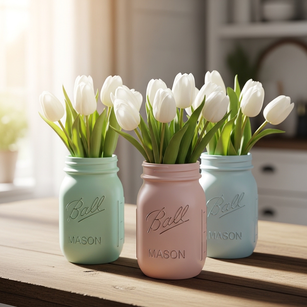 Pastel-colored mason jars offer a simple yet refined way to introduce spring hues. Painted in soft shades like mint, blush, and baby blue, these jars can hold fresh flowers or decorative eggs.