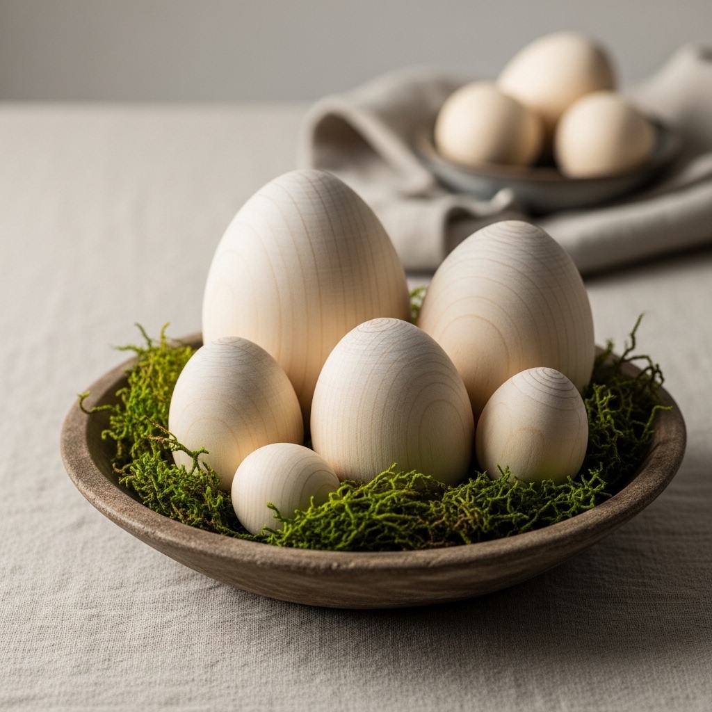 A wooden egg centerpiece creates a grounded, natural focal point for Easter tables. This includes carved wooden eggs arranged in a shallow bowl or tray, often paired with moss or greenery.