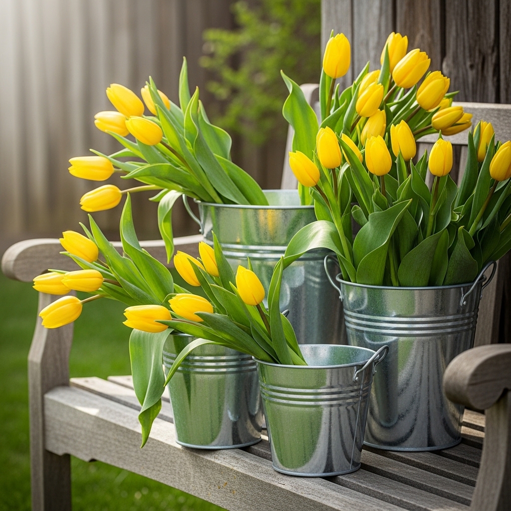 Galvanized metal planters introduce a subtle industrial edge to farmhouse decor. Filled with spring blooms like tulips or daffodils, they can be placed on porches, shelves, or kitchen counters.