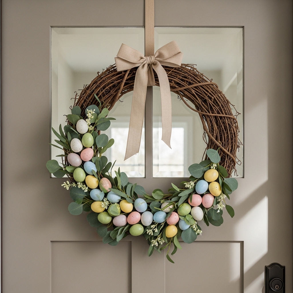 A rustic Easter wreath welcomes guests with understated elegance. Made with grapevine bases, faux eggs, greenery, and muted ribbons, it can be hung on doors or interior walls.