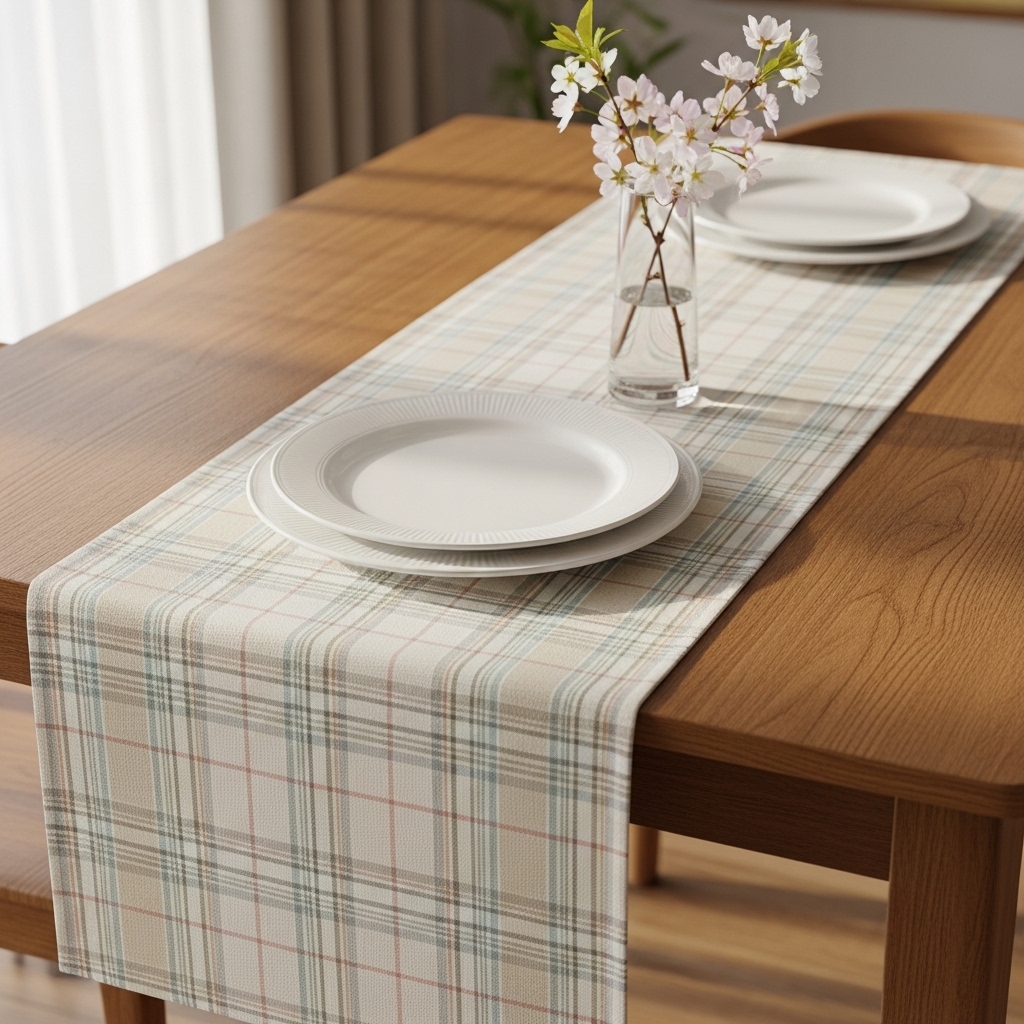 A plaid table runner adds pattern while staying within a soft farmhouse palette. Typically in muted tones like beige, grey, or pastel hues, it anchors your dining setup.
