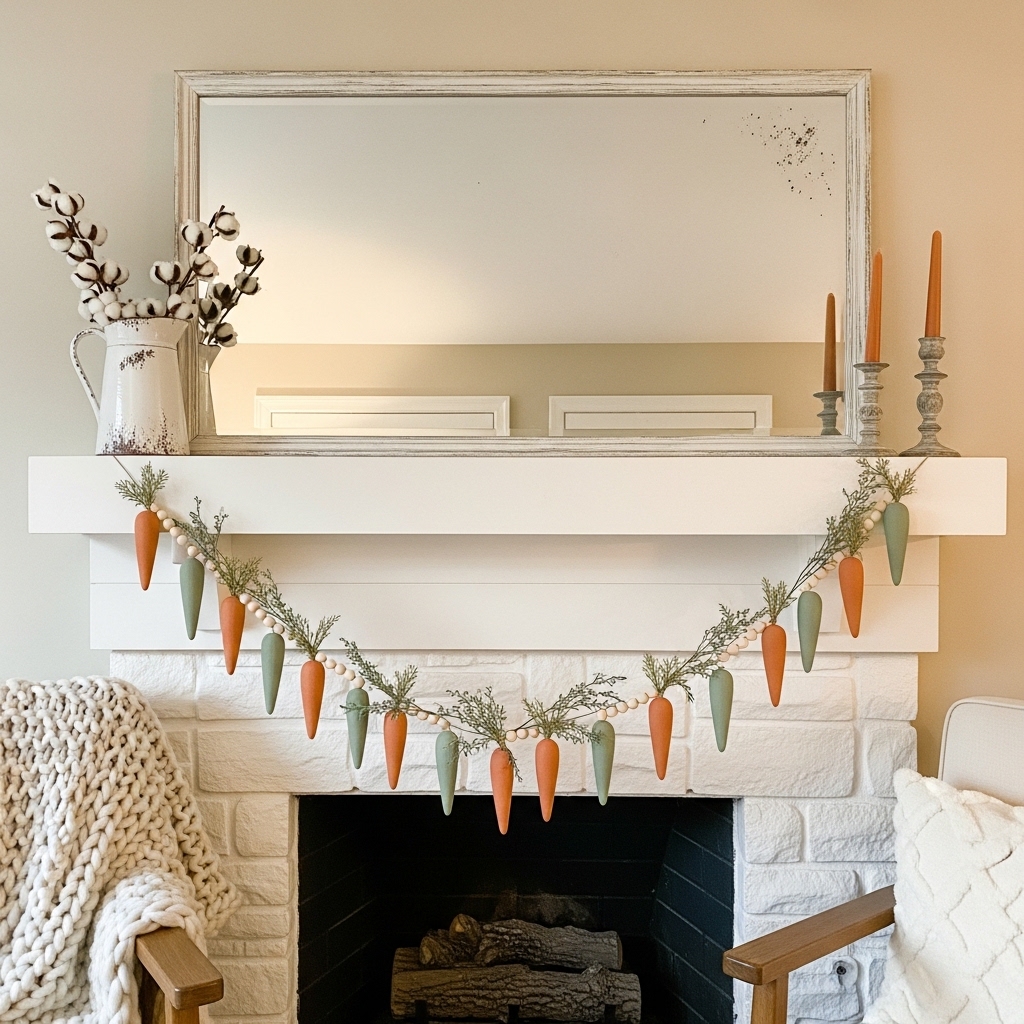 A wooden carrot garland brings playful charm in a refined way. Featuring carved wooden carrots painted in soft orange and green tones, it can be draped across mantels or shelves.