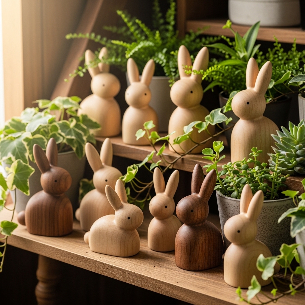 Rustic bunny figurines bring a subtle seasonal touch without overwhelming the space. Made from wood, ceramic, or resin, they are best styled in small clusters.