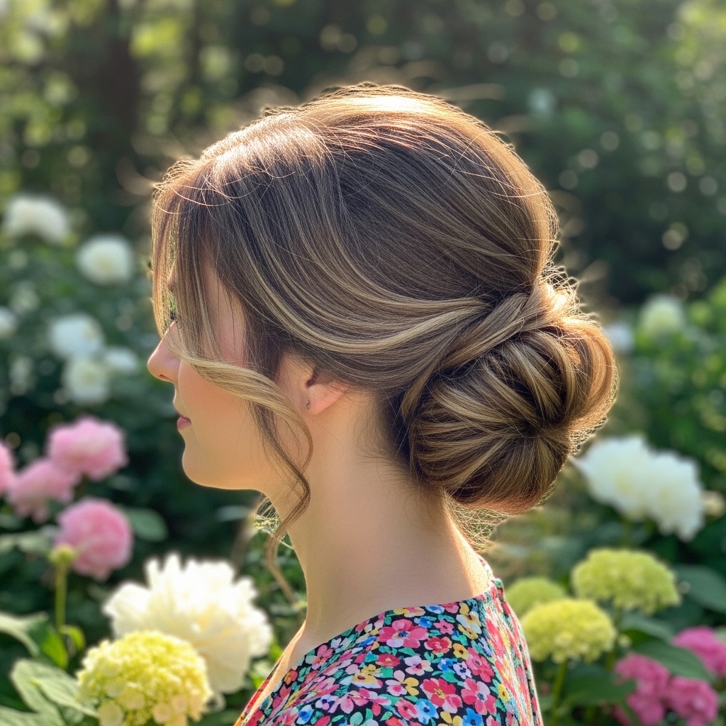 The soft romantic low chignon is a timeless hairstyle that gathers hair neatly at the nape while allowing loose tendrils to frame the face. This look is especially flattering with softly curled or naturally textured hair, creating an airy, graceful finish. It works beautifully for formal Easter gatherings or elegant brunch settings where understated sophistication is key.