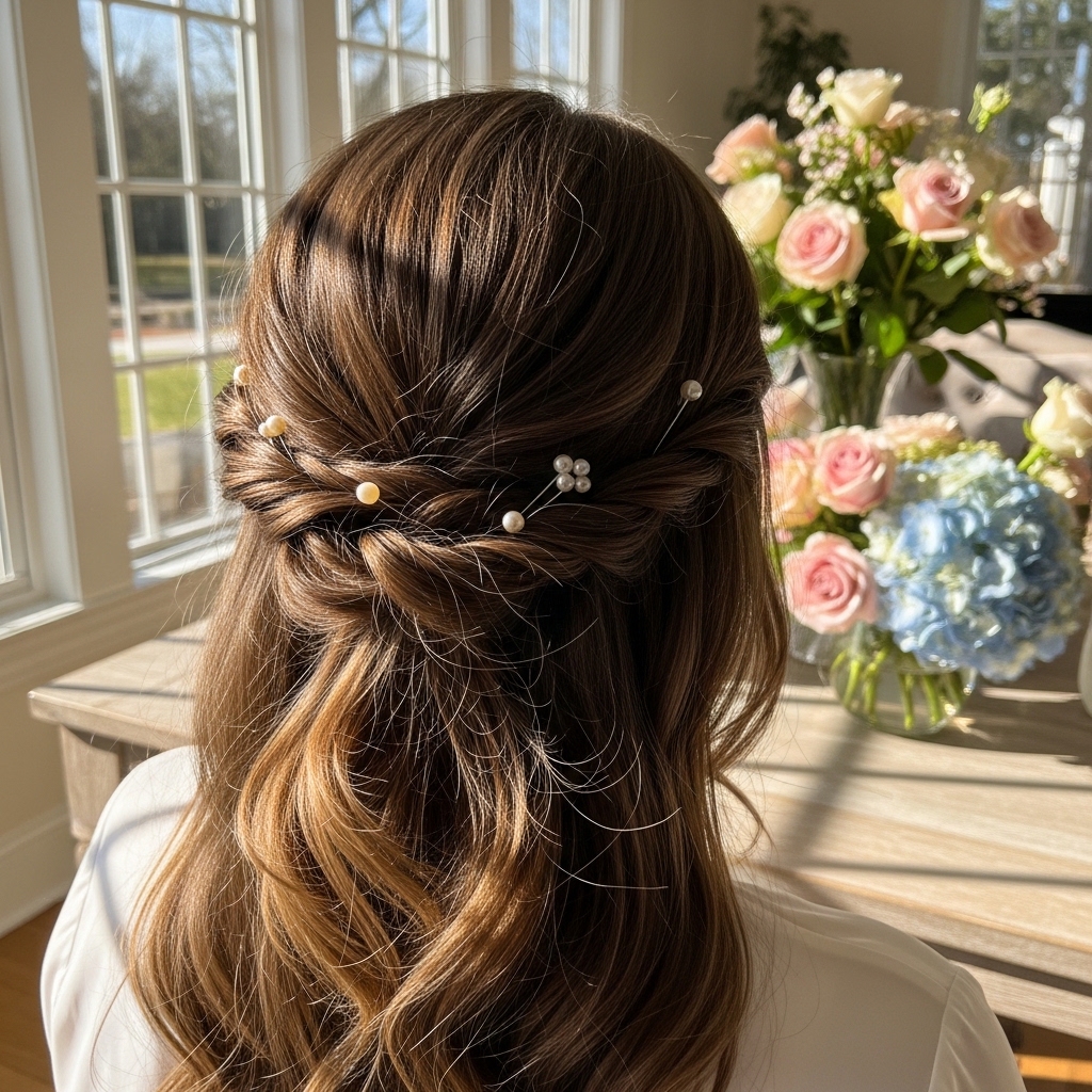 The elegant half-up pearl twist combines sophistication with delicate detailing. The top section of hair is twisted and pinned at the back, often adorned with pearl accessories for a refined touch.