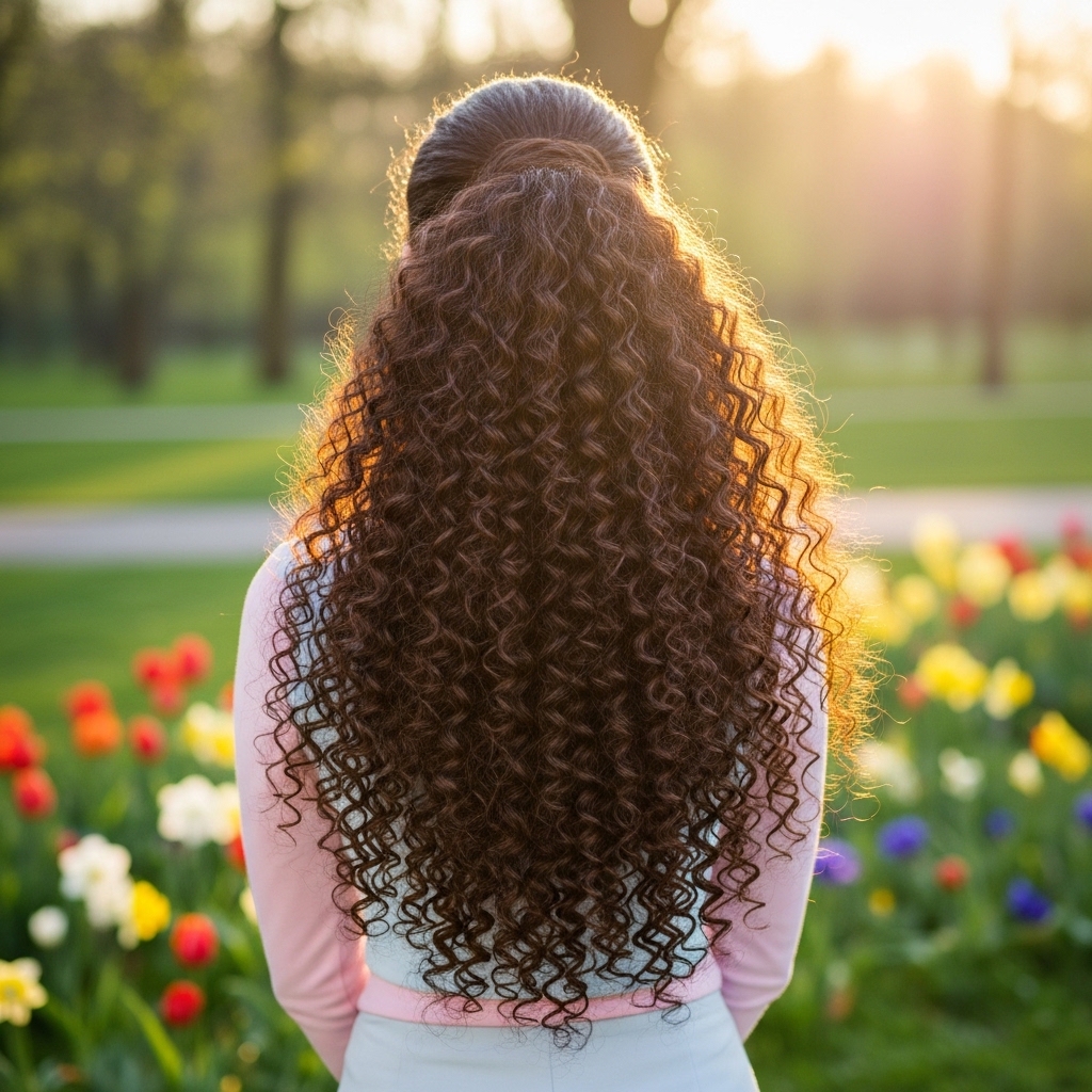 The voluminous curly ponytail brings energy and glamour to Easter styling. Hair is gathered into a mid or high ponytail while maintaining full, defined curls that create bounce and volume.
