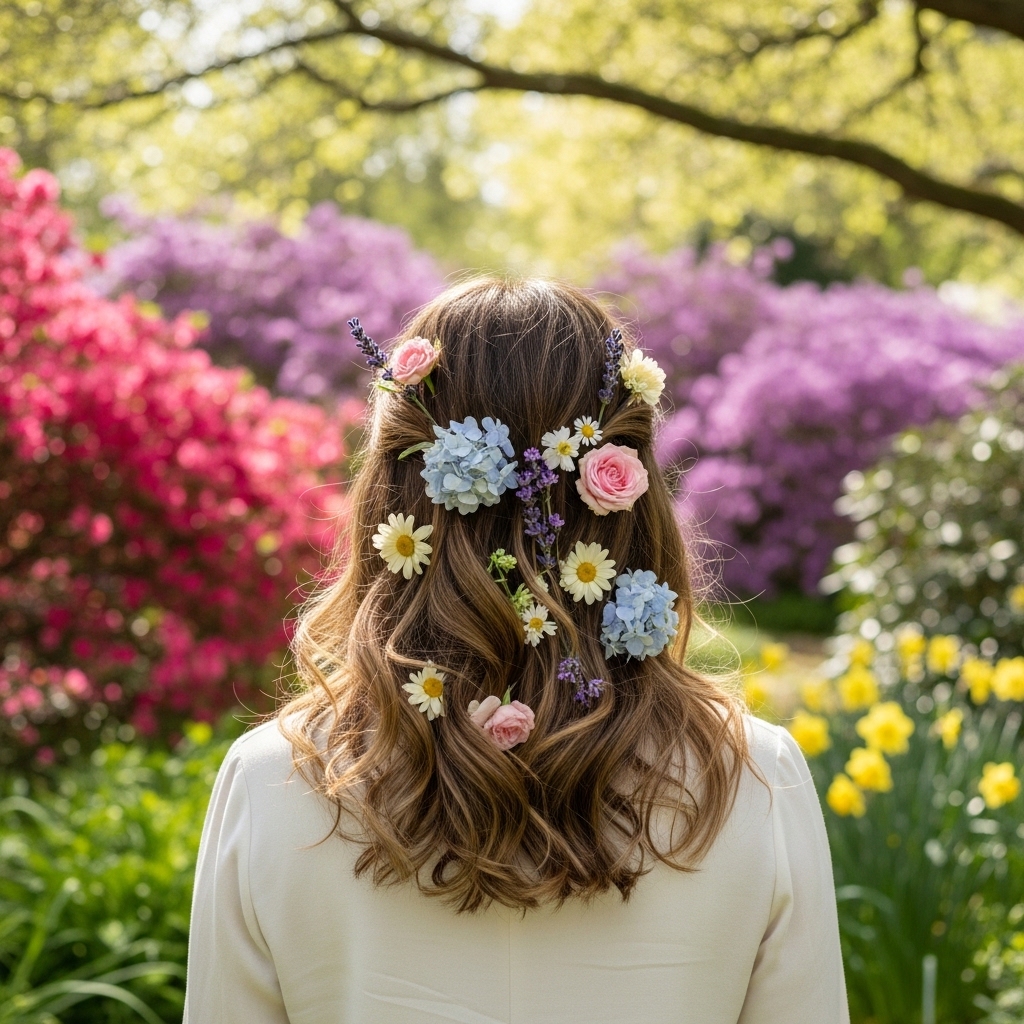 Loose waves adorned with floral accessories capture the essence of Easter beautifully. Soft curls cascade naturally, while small flowers or floral pins are placed throughout the hair.
