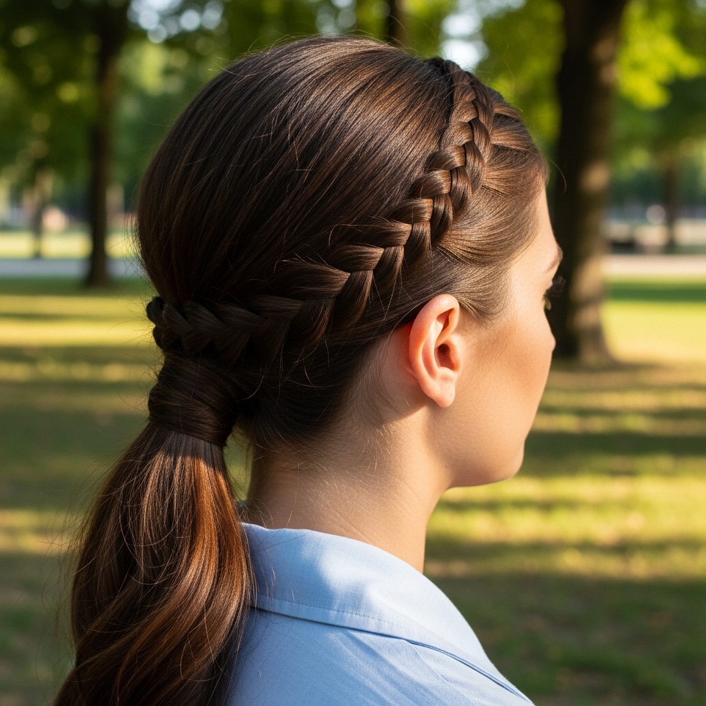 The braided low ponytail blends classic braiding with a modern silhouette. A simple braid leads into a low ponytail, creating a structured yet relaxed appearance.