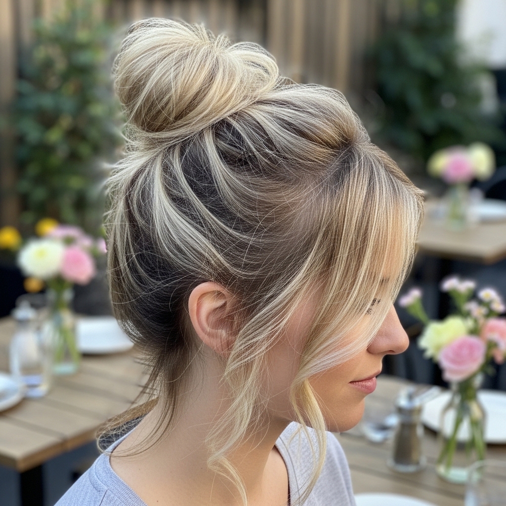 The messy bun with soft tendrils is a go-to for relaxed elegance. Hair is loosely gathered into a bun, with delicate strands left out to frame the face.