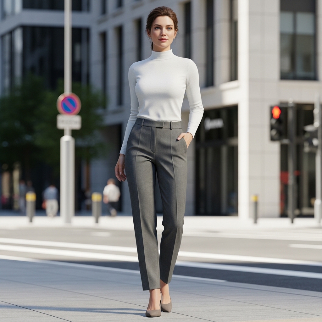 This look combines a crisp white mock neck top with structured gray tailored trousers, creating a clean and sophisticated silhouette. The fitted top contrasts beautifully with the relaxed drape of the trousers, offering balance and visual interest.