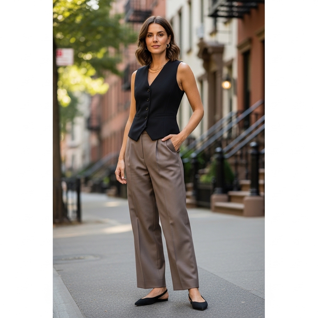 A structured black vest paired with soft taupe trousers creates a refined yet contemporary look. The vest adds sharpness and structure, while the trousers soften the overall aesthetic with their relaxed fit.