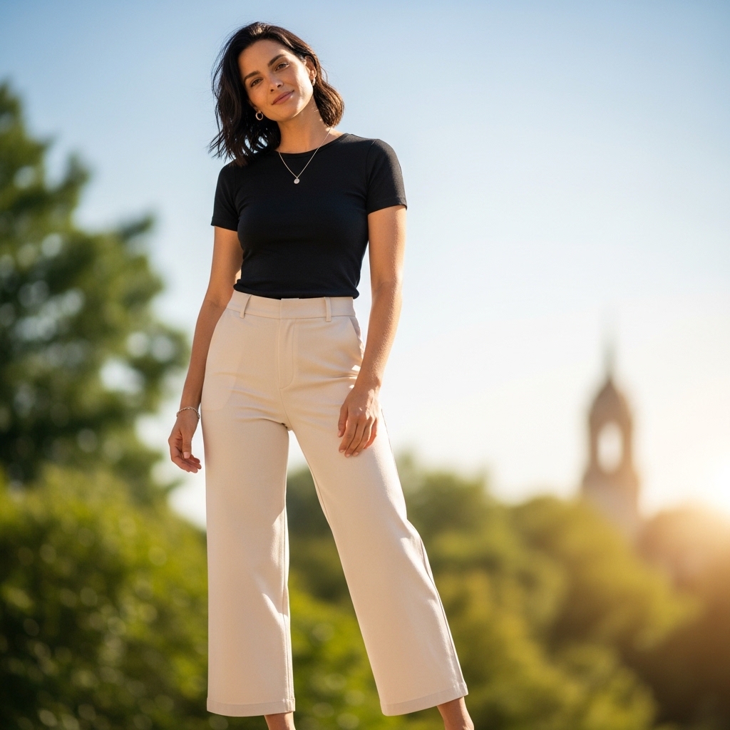 This effortless combination features a simple black tee tucked into cream wide-leg pants. The clean lines and contrasting tones create a timeless and easygoing outfit.