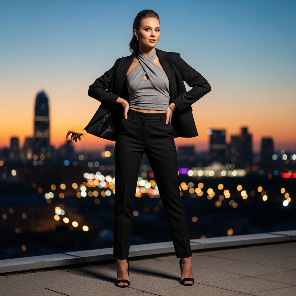 This outfit works well for office environments or stylish evening outings. It balances comfort through breathable materials while maintaining a sleek, tailored appearance. The contrast between dark and light tones adds depth without overwhelming the look.