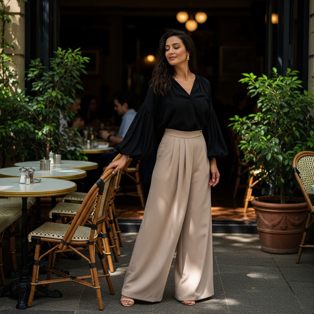 A flowy black blouse combined with beige wide-leg pants creates a balanced and elegant look. The softness of the blouse contrasts with the structure of the trousers, resulting in a flattering silhouette.