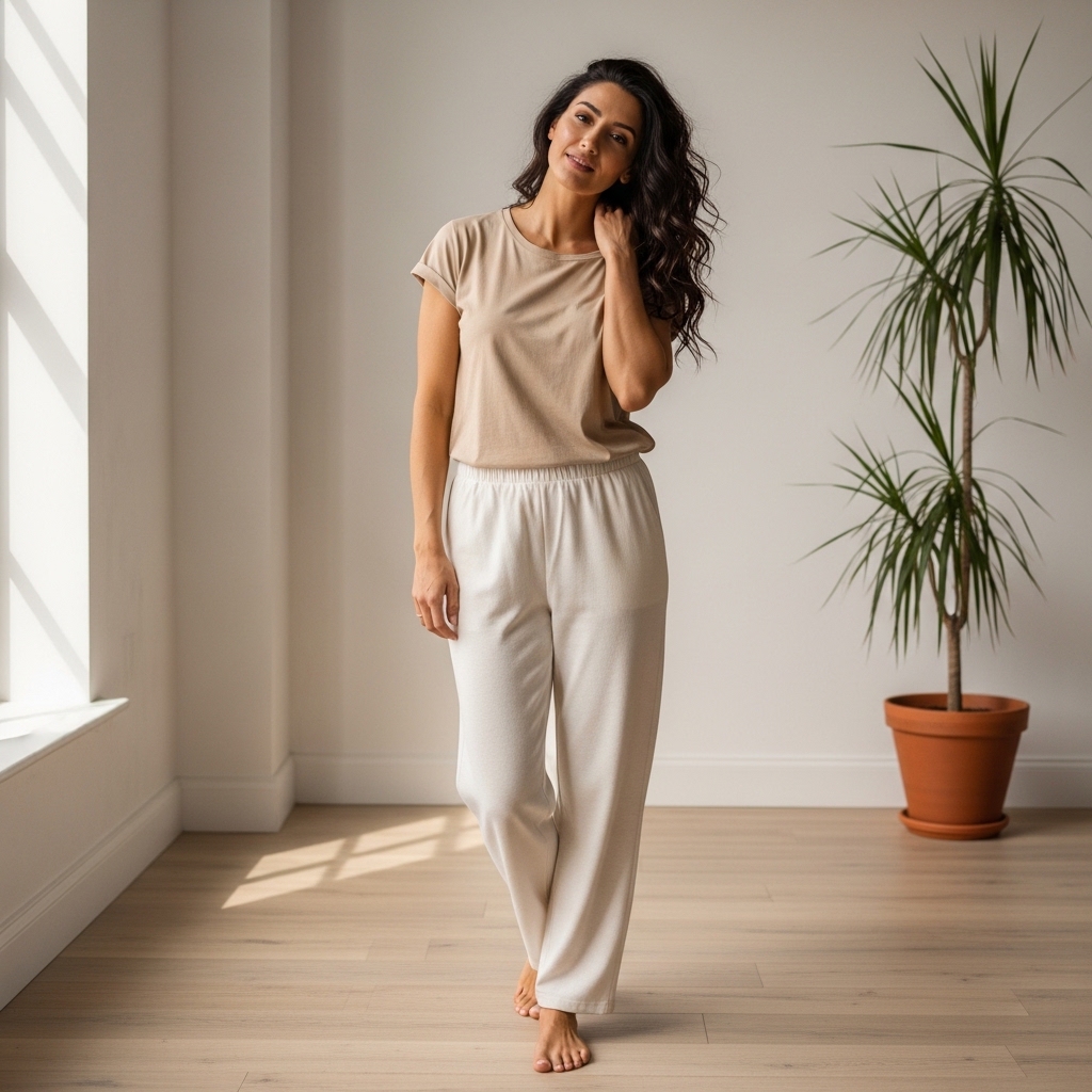 This outfit works well for professional and casual settings alike. It offers comfort through simple, breathable fabrics while maintaining a sleek, elevated appearance.