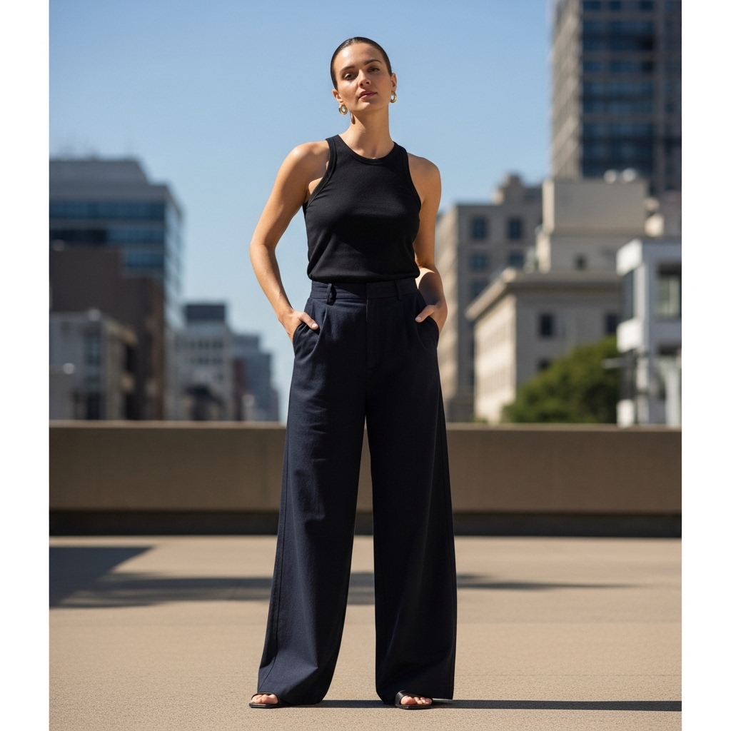 A fitted black tank paired with wide-leg pants creates a simple yet impactful silhouette. The contrast between fitted and loose elements adds balance and sophistication.