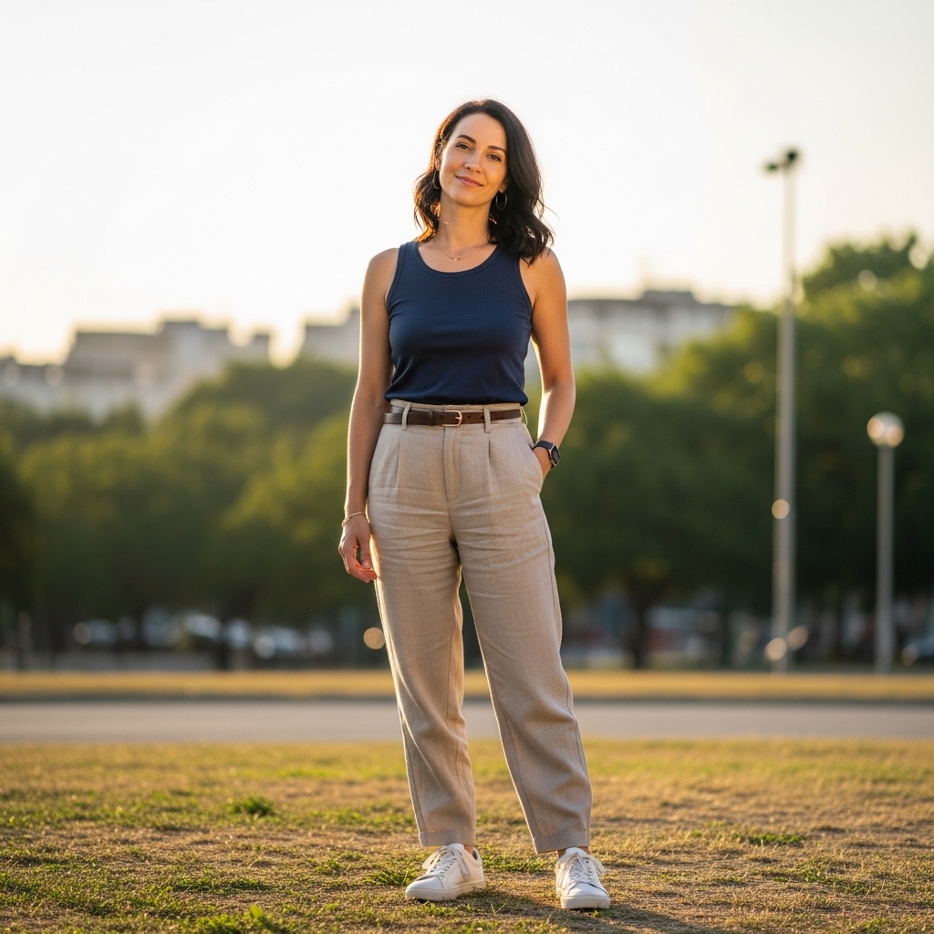 The combination of a navy tank and beige trousers offers a refined color contrast that feels fresh and understated. The deep navy adds richness, while beige keeps the look light.