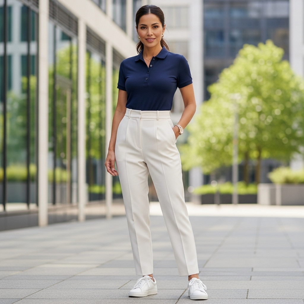 A navy polo shirt paired with tailored trousers blends sporty and polished elements. The structured trousers elevate the casual feel of the polo.