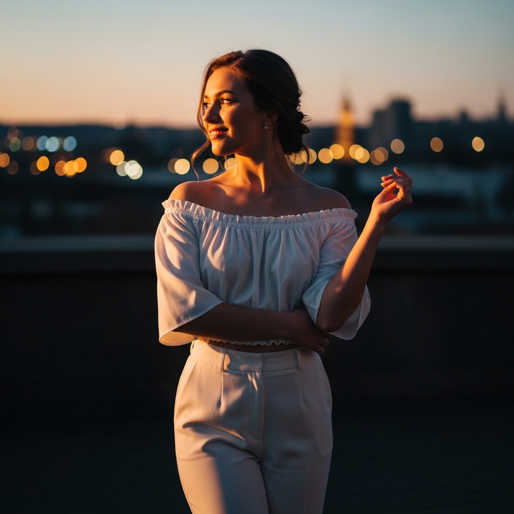 This look pairs a white off-shoulder top with tailored trousers, blending femininity with structure. The exposed neckline adds softness, while the trousers ground the outfit.