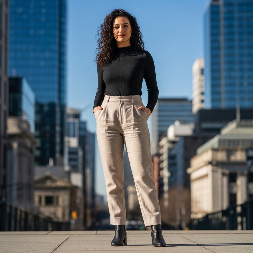 A black mock neck styled with beige trousers creates a striking contrast that feels both modern and timeless. The fitted top enhances the silhouette, while the trousers add movement.