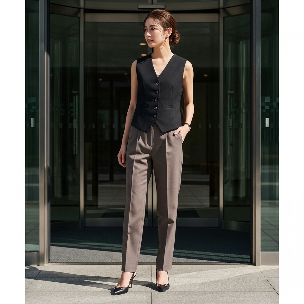 A black vest styled with taupe trousers offers a tailored yet fashion-forward approach to summer workwear. The vest, worn alone or layered lightly, adds structure without the heaviness of a blazer, while taupe trousers soften the overall look with a warm neutral tone.
