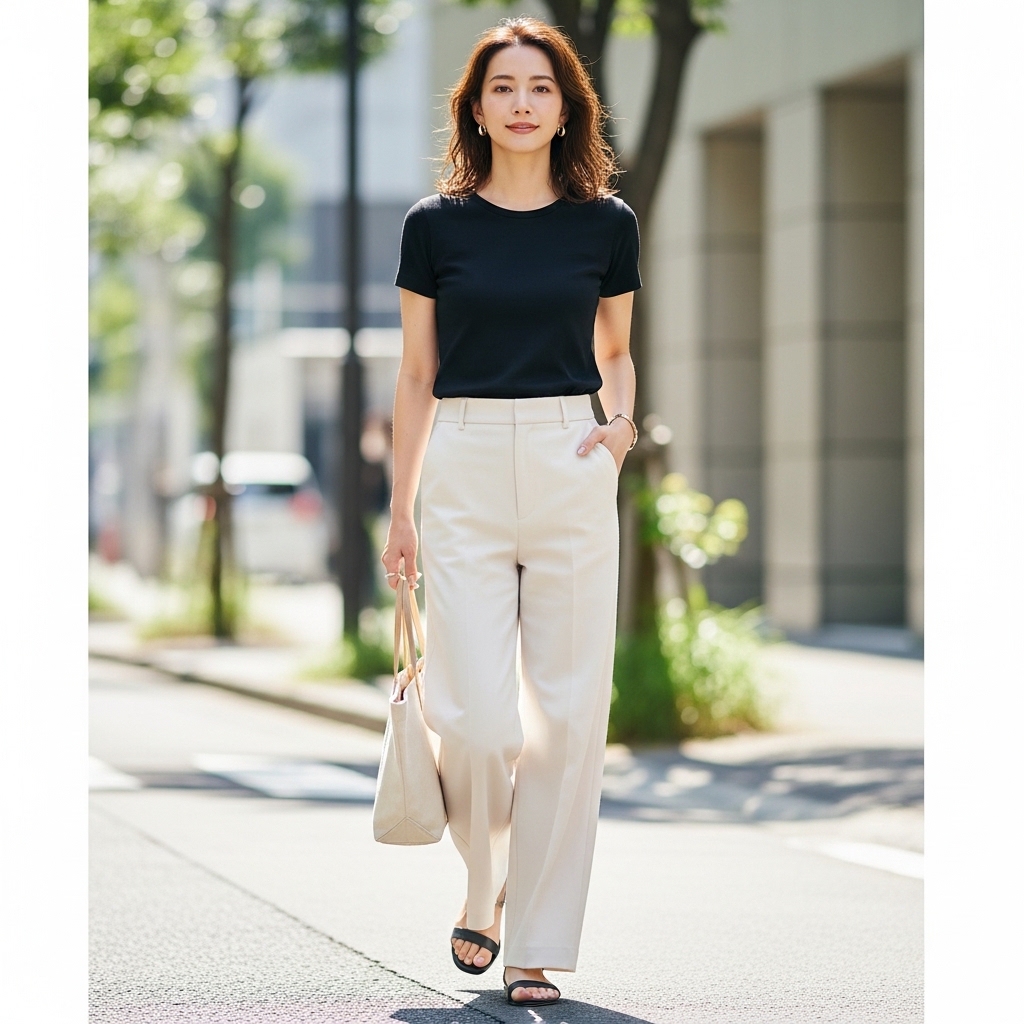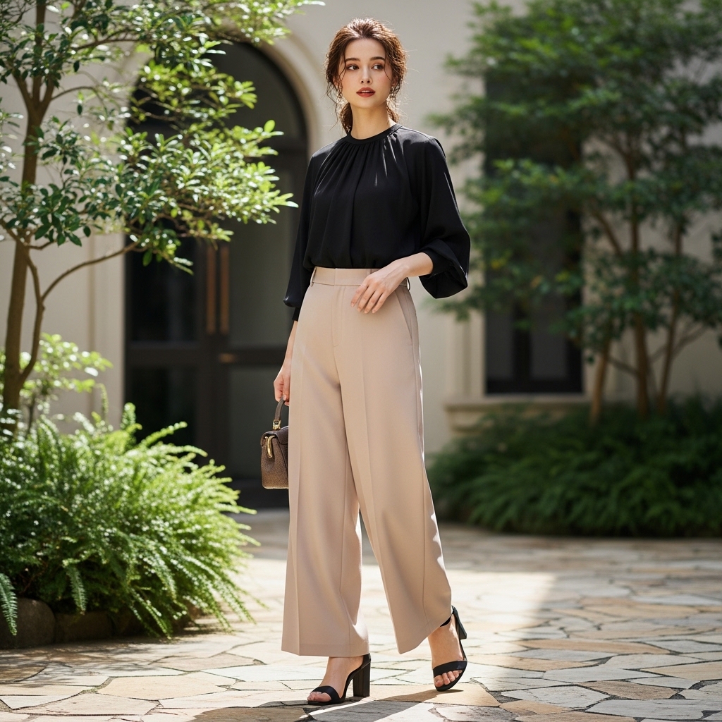 A black blouse combined with beige wide-leg pants offers a classic yet relaxed aesthetic. The blouse provides a polished touch, while the wide-leg pants introduce softness and movement.