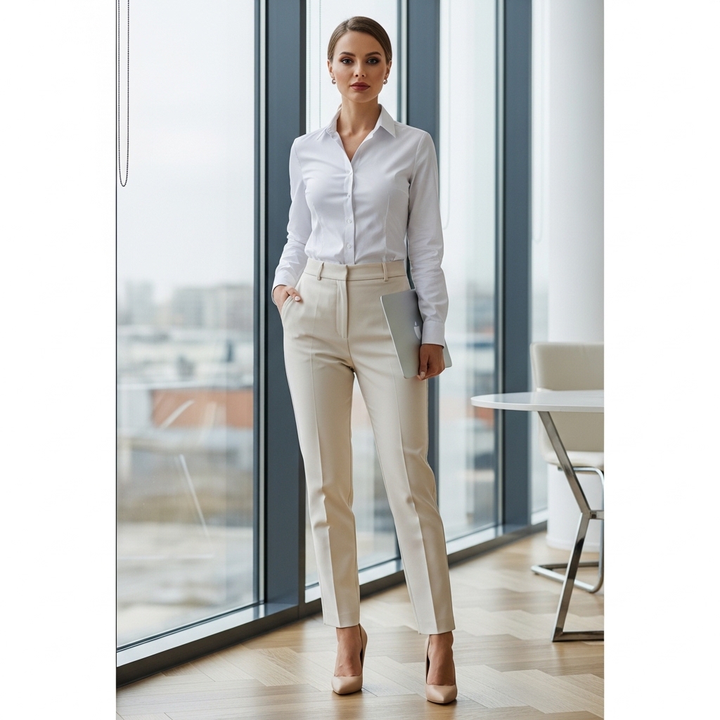 A white button-up shirt styled with cream trousers creates a monochromatic look that feels fresh and elevated. The clean lines of the button-up bring structure, while the soft cream tones add warmth and subtle elegance.