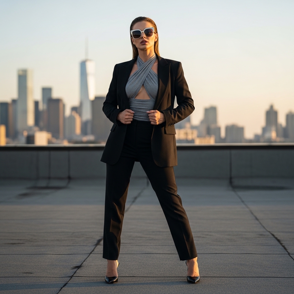 This trend redefines power dressing for summer by pairing a black suit with a gray halter top. The halter adds a contemporary, slightly bold element, while the suit maintains a strong, structured silhouette.