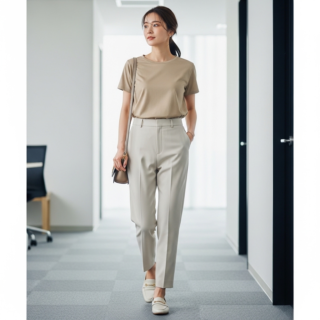 A beige tee styled with cream trousers creates a soft, tonal outfit that feels calm and sophisticated. The simplicity of the tee is elevated by the tailored trousers, resulting in a look that is both relaxed and polished.