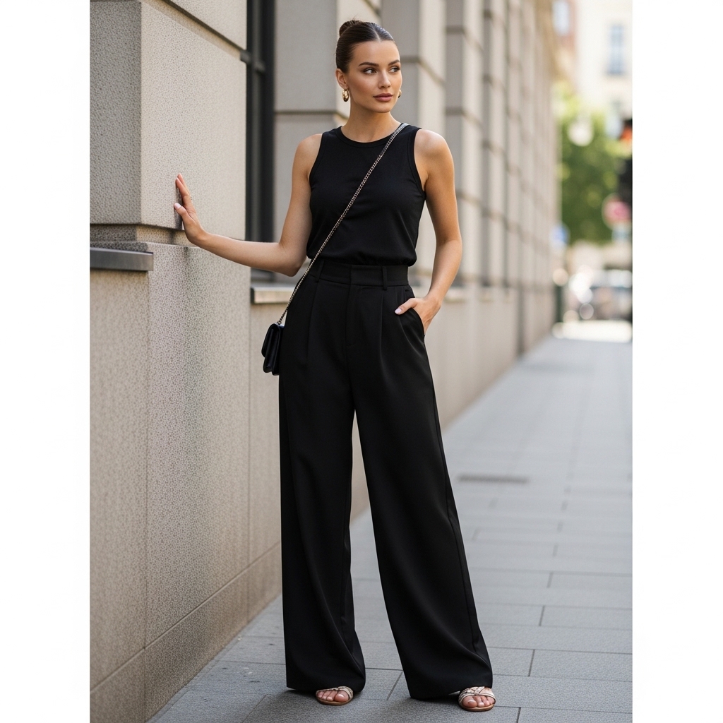 A black tank paired with wide-leg pants offers a minimalist yet chic outfit for summer workdays. The tank keeps things simple and breathable, while the pants add volume and structure.