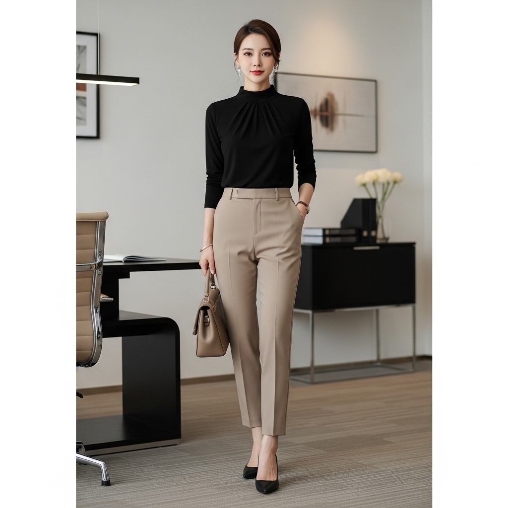 A black mock neck paired with beige trousers delivers a sleek, minimalist look that works across various work settings. The mock neck adds structure, while the beige trousers soften the overall appearance.