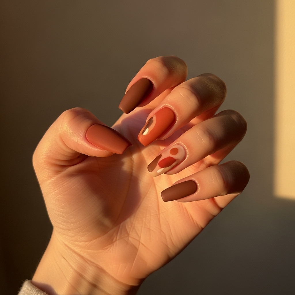 Earth-toned nails incorporate shades like terracotta, warm brown, and muted clay. These colors bring depth and richness while maintaining a grounded, natural feel. Often styled in matte or glossy finishes, they can include subtle geometric or abstract designs.