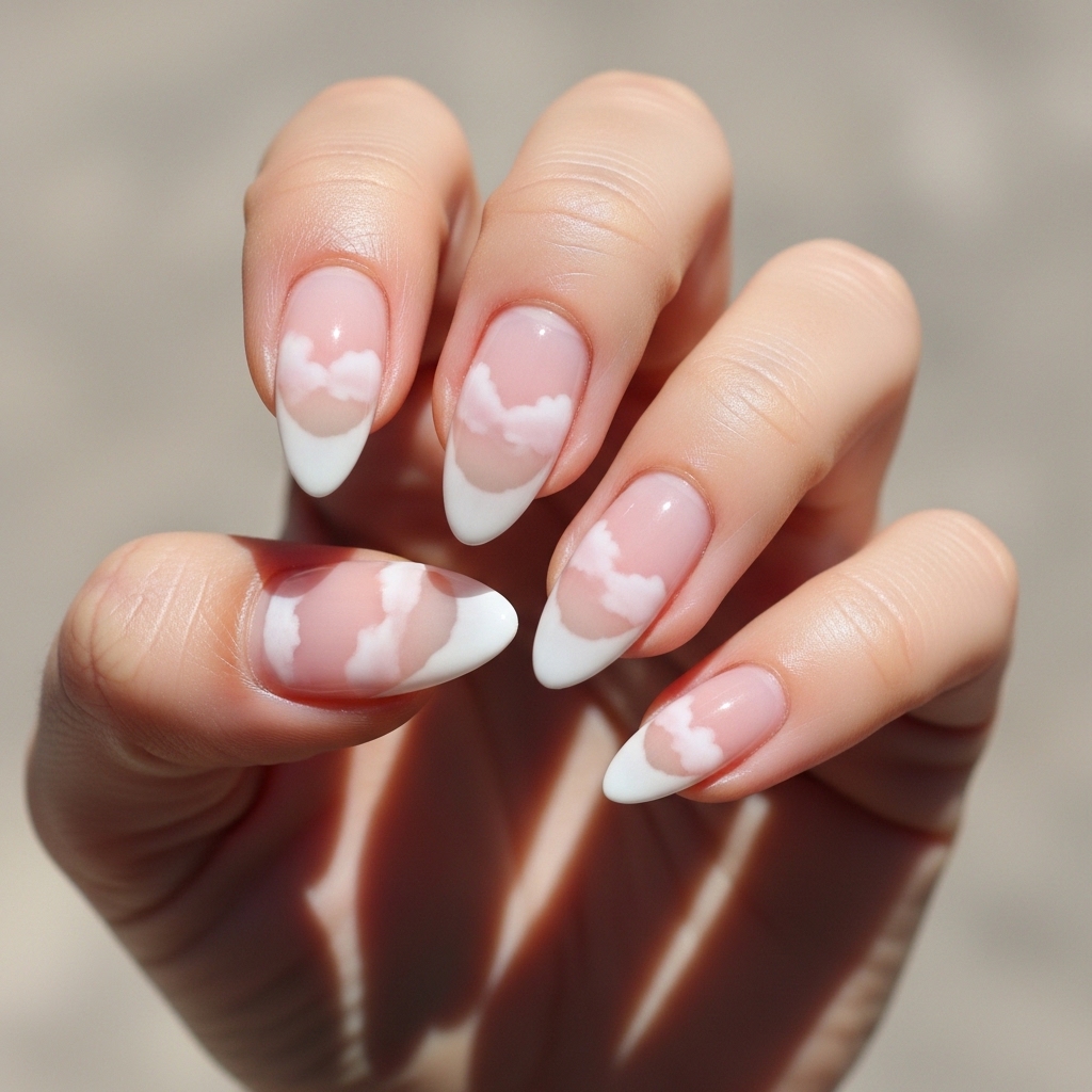 Cloudy French is a soft reinterpretation of the classic French manicure, using blurred or diffused white tips instead of sharp lines. The base remains sheer and natural, while the tips appear airy and blended.