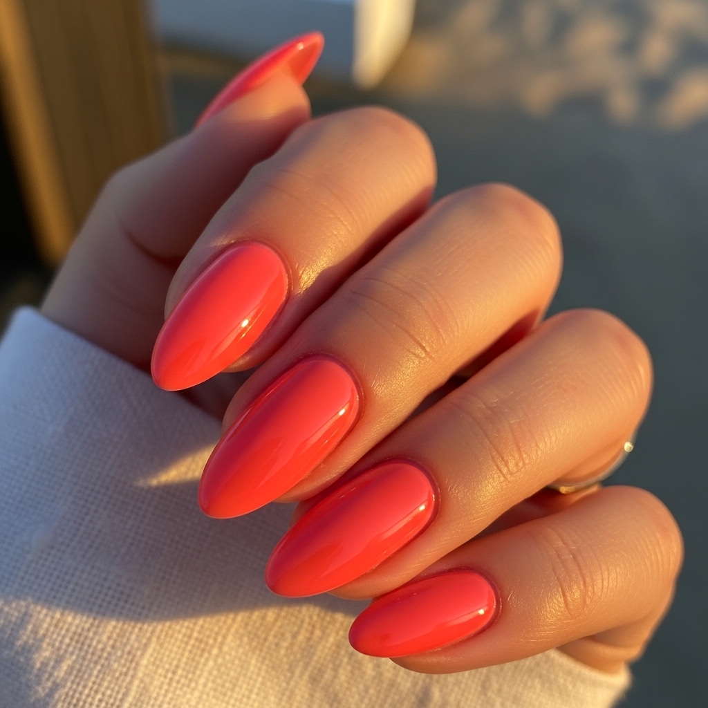 Perfect for beach vacations, evening dinners, and festive occasions, coral flatters a wide range of skin tones. Almond shapes soften the boldness and make the manicure feel elevated rather than loud. The glossy finish keeps the look fresh and sophisticated.