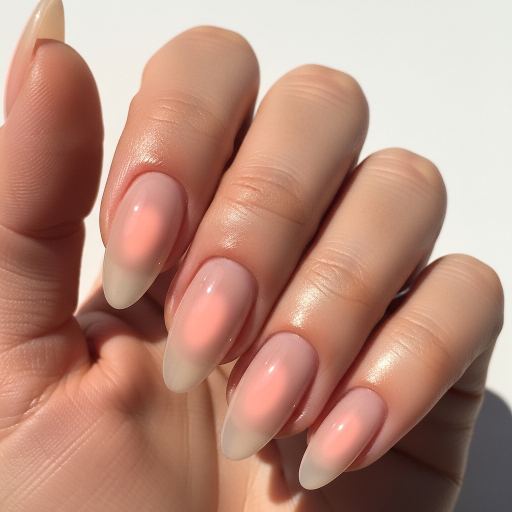 Peach tones evolve into soft aura blends for late spring and early summer. A sheer base supports a diffused peach center that creates a subtle glowing effect.