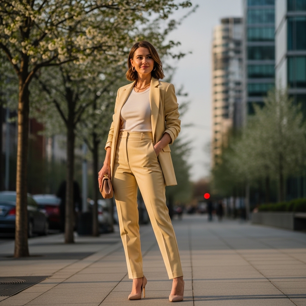 A butter yellow tailored blazer paired with high waisted straight leg trousers defines refined spring power dressing. The fabric is lightweight linen blend, allowing breathability while maintaining structure. Underneath, a simple ivory tank keeps the look soft and fresh.