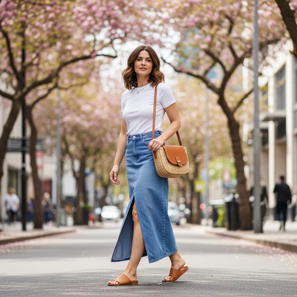A high waisted light wash denim maxi skirt paired with a fitted white ribbed tee creates an effortless yet elevated spring look. The skirt flows naturally with movement, while a subtle front slit adds dimension.