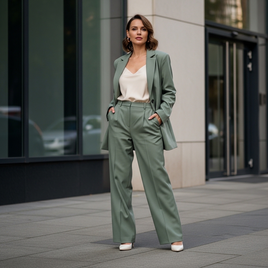 This look features a sage green oversized blazer with matching wide leg trousers and a silky cream camisole underneath. The muted green tone captures the fresh energy of spring while maintaining sophistication.