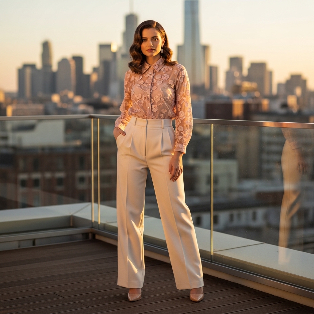 A sheer blush blouse with delicate embroidery paired with high waisted tailored cream trousers creates a romantic yet polished ensemble. Subtle texture and soft draping add dimension without overwhelming the look.