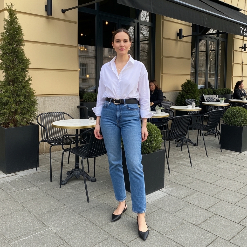 A classic oversized white button down tucked loosely into straight leg blue jeans becomes elevated with a structured belt and pointed flats. The look is clean, minimal, and effortlessly chic.