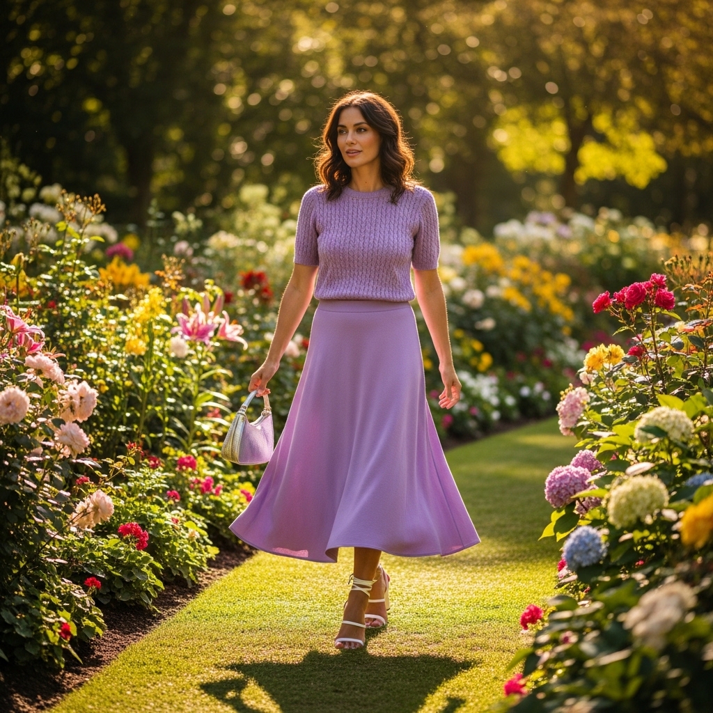 A soft lavender knit top paired with a matching midi skirt creates a cohesive and calming spring statement. The knit texture hugs the body gently without feeling restrictive.