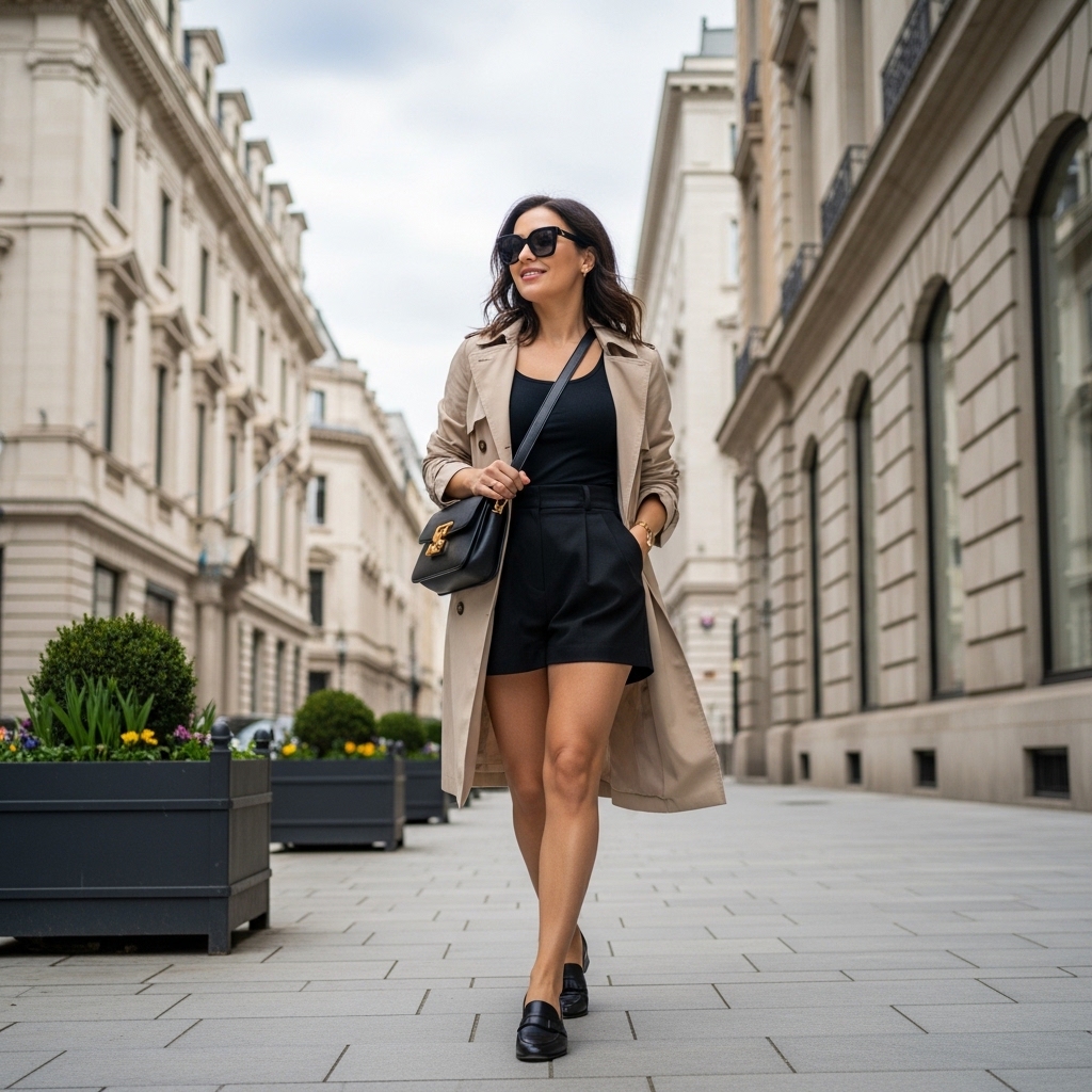 A lightweight beige trench coat layered over a fitted black tank and high waisted tailored shorts offers transitional spring sophistication. The trench flows effortlessly with movement.