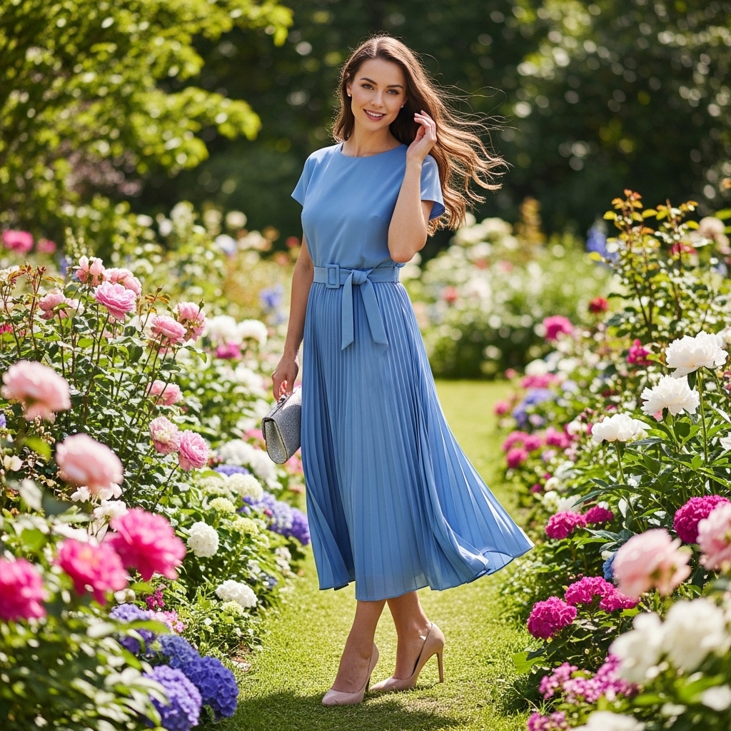 A powder blue pleated midi dress with subtle waist definition captures timeless femininity. The flowing fabric moves gracefully with every step.