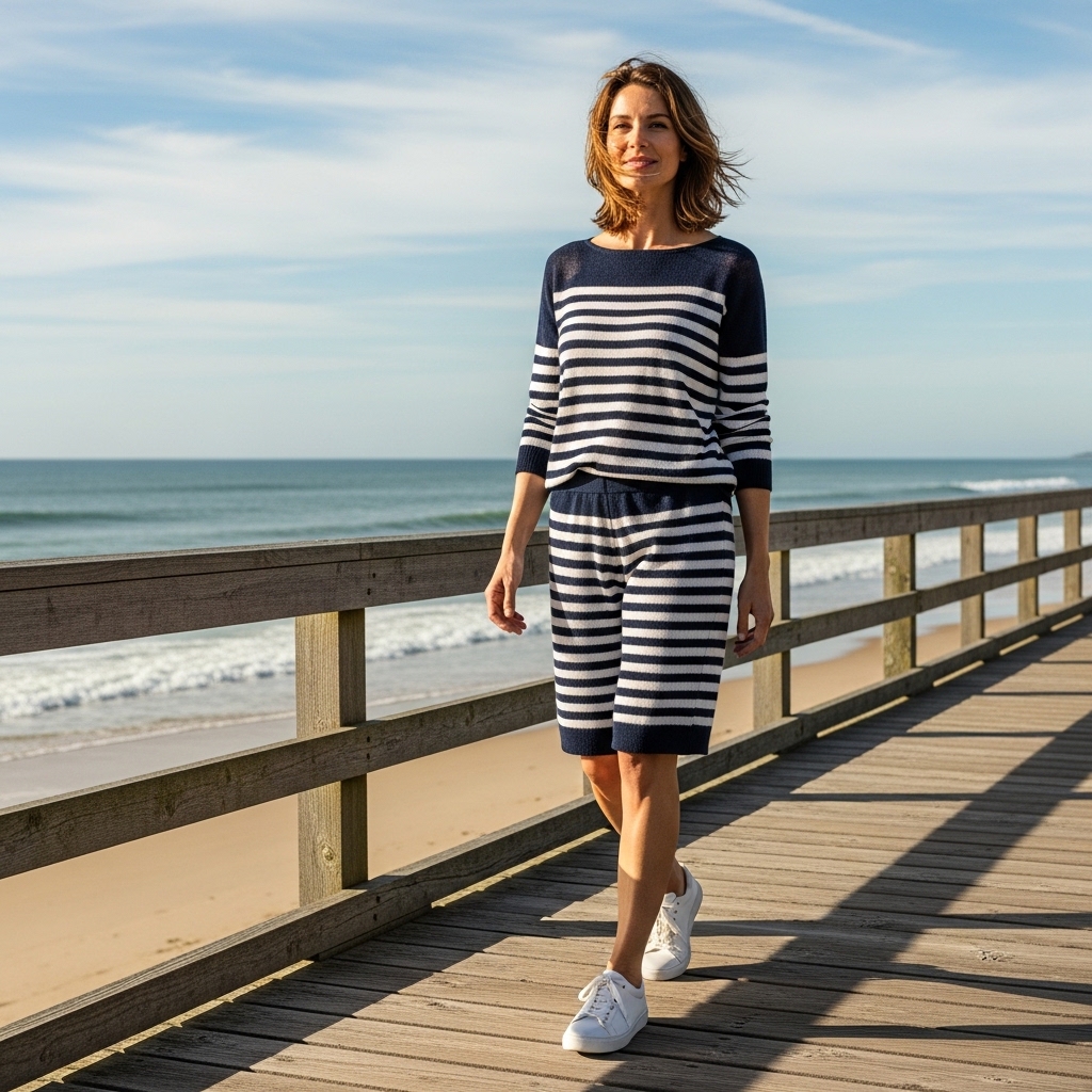 A lightweight striped knit sweater paired with matching knit shorts in soft navy and white channels effortless coastal energy. The relaxed fit keeps the look breezy and comfortable.