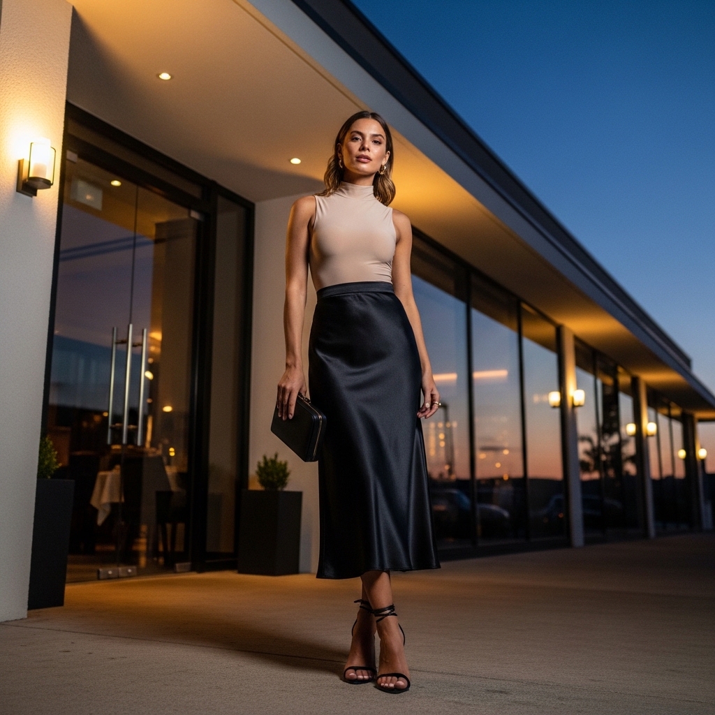 A sleek black satin midi skirt styled with a fitted neutral bodysuit creates understated drama. The satin finish catches light subtly, elevating a simple silhouette.