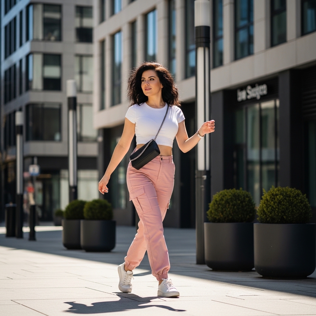 A blush toned cargo pant styled with a fitted white crop top and sleek sneakers merges utility with softness. The structured pockets add dimension while the pastel hue keeps it refined.