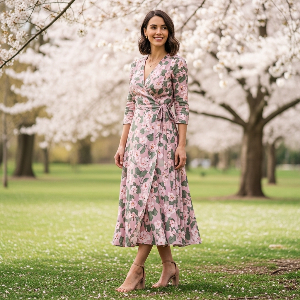 A lightweight floral wrap dress in soft pink and green tones embodies timeless spring romance. The adjustable waist creates a flattering silhouette for many body types.