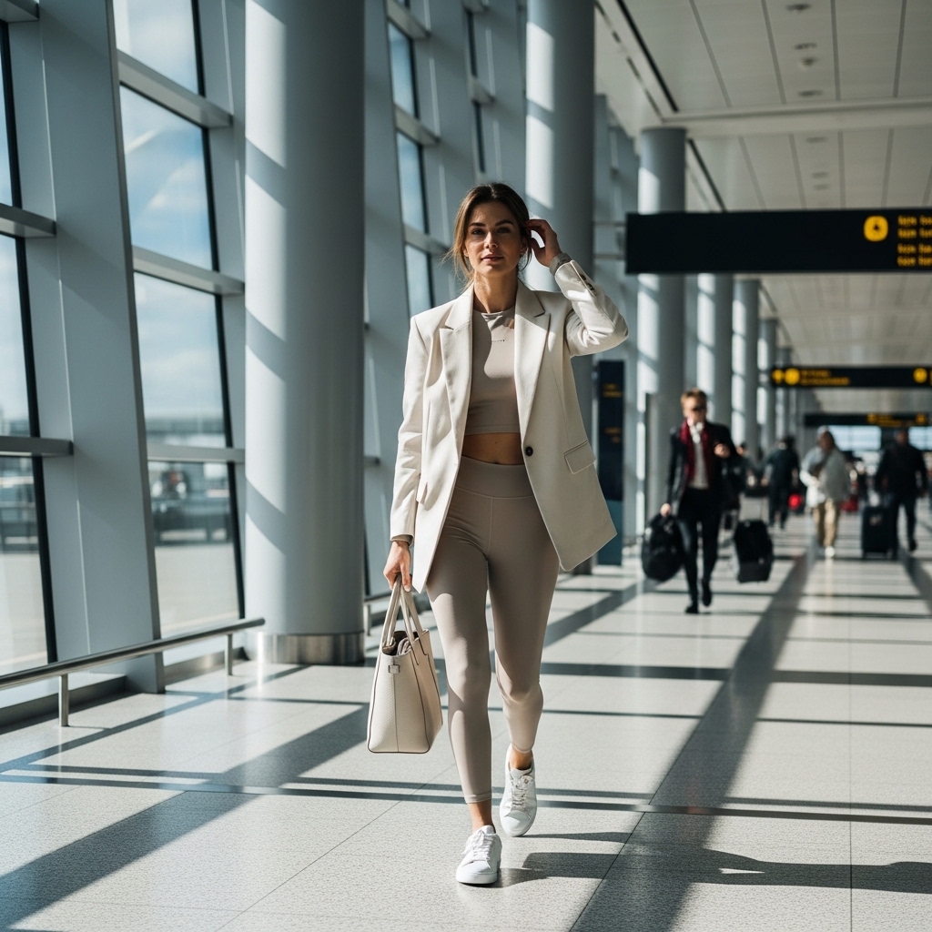 A tailored cream blazer layered over a fitted athletic set with sleek white sneakers blends sophistication with sport. The contrast between structure and stretch defines modern styling.