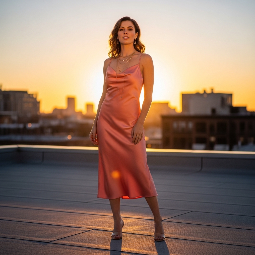 A soft coral satin slip dress styled with delicate layered necklaces and minimalist heels feels romantic yet contemporary. The smooth fabric skims the body elegantly.